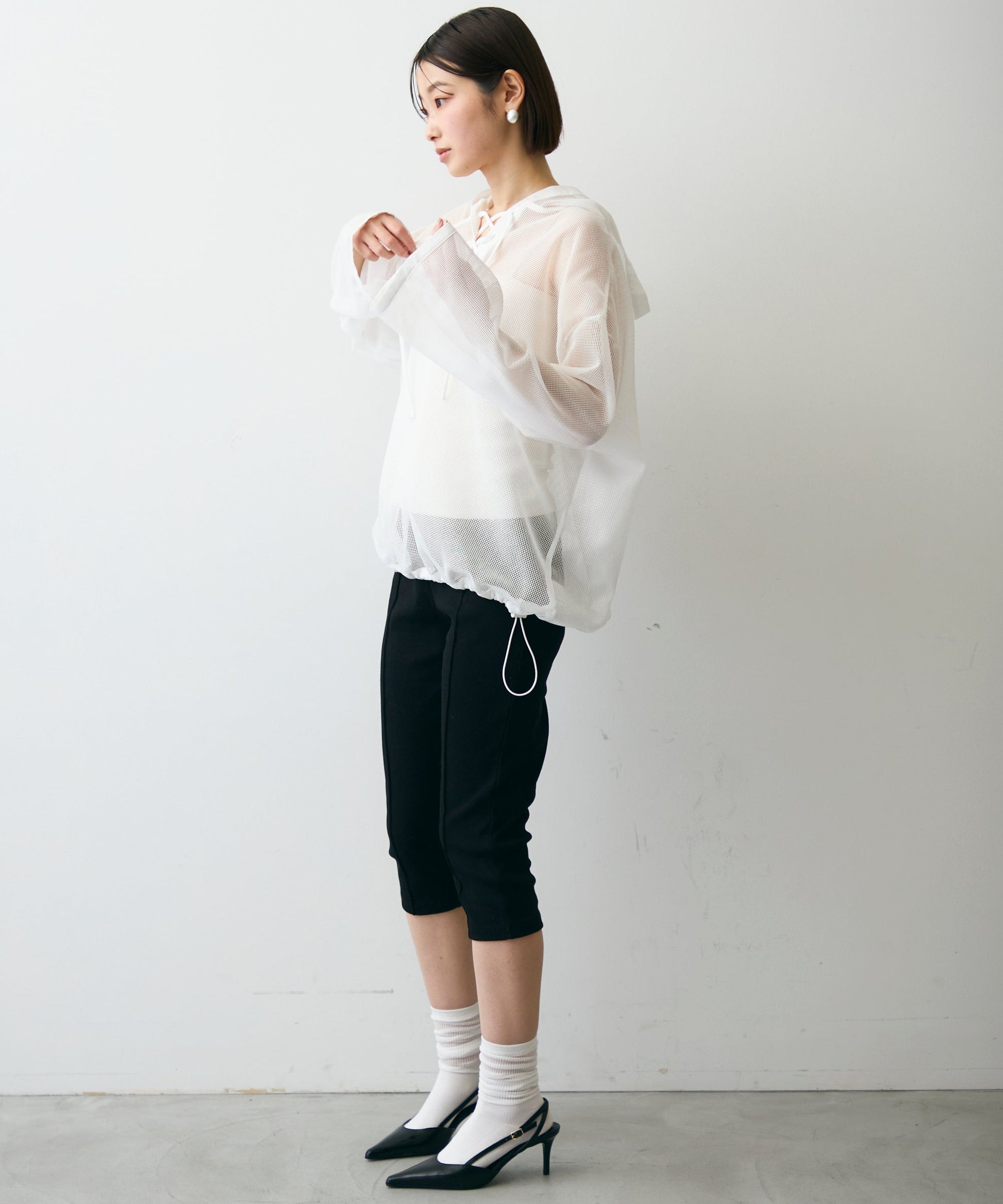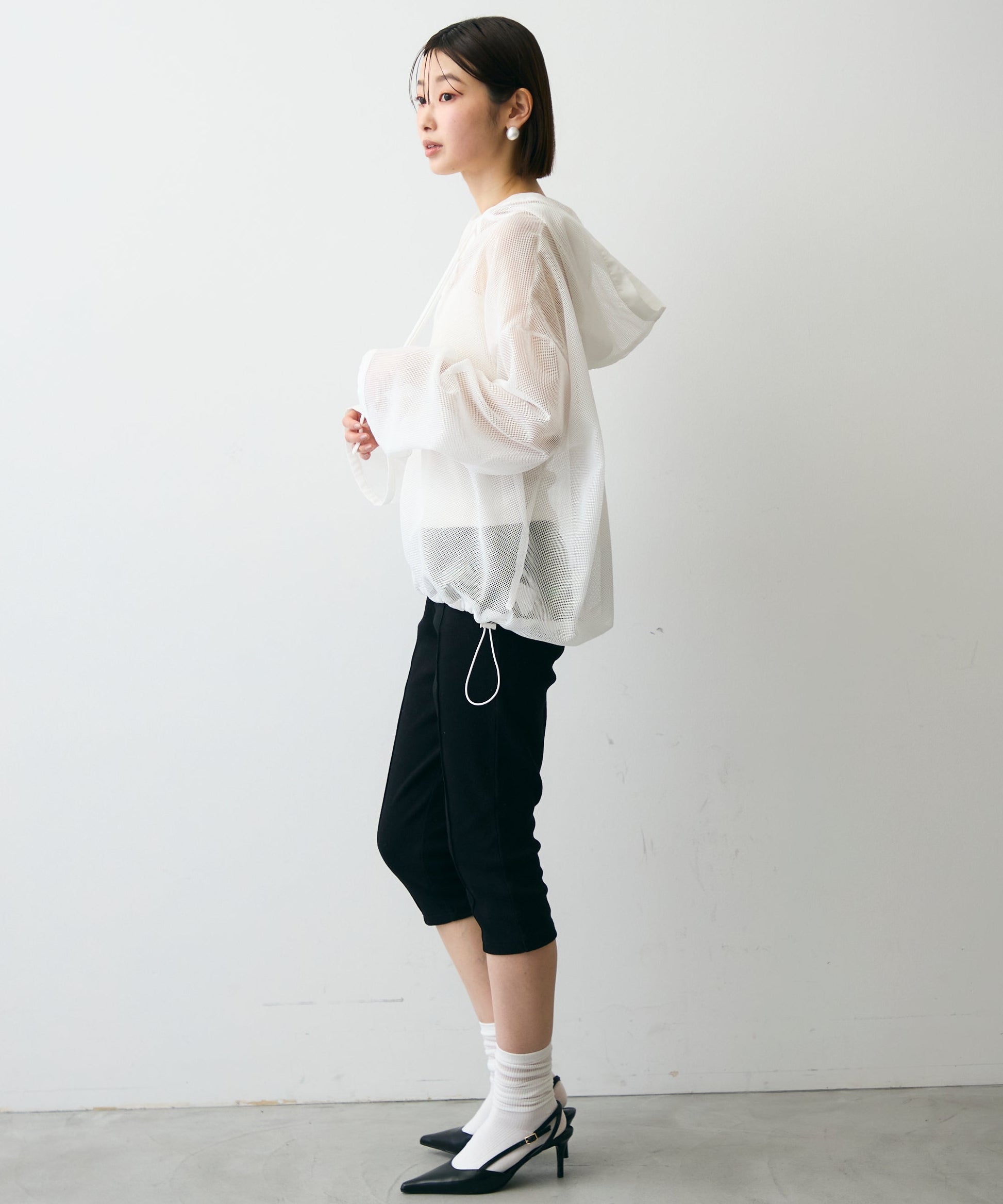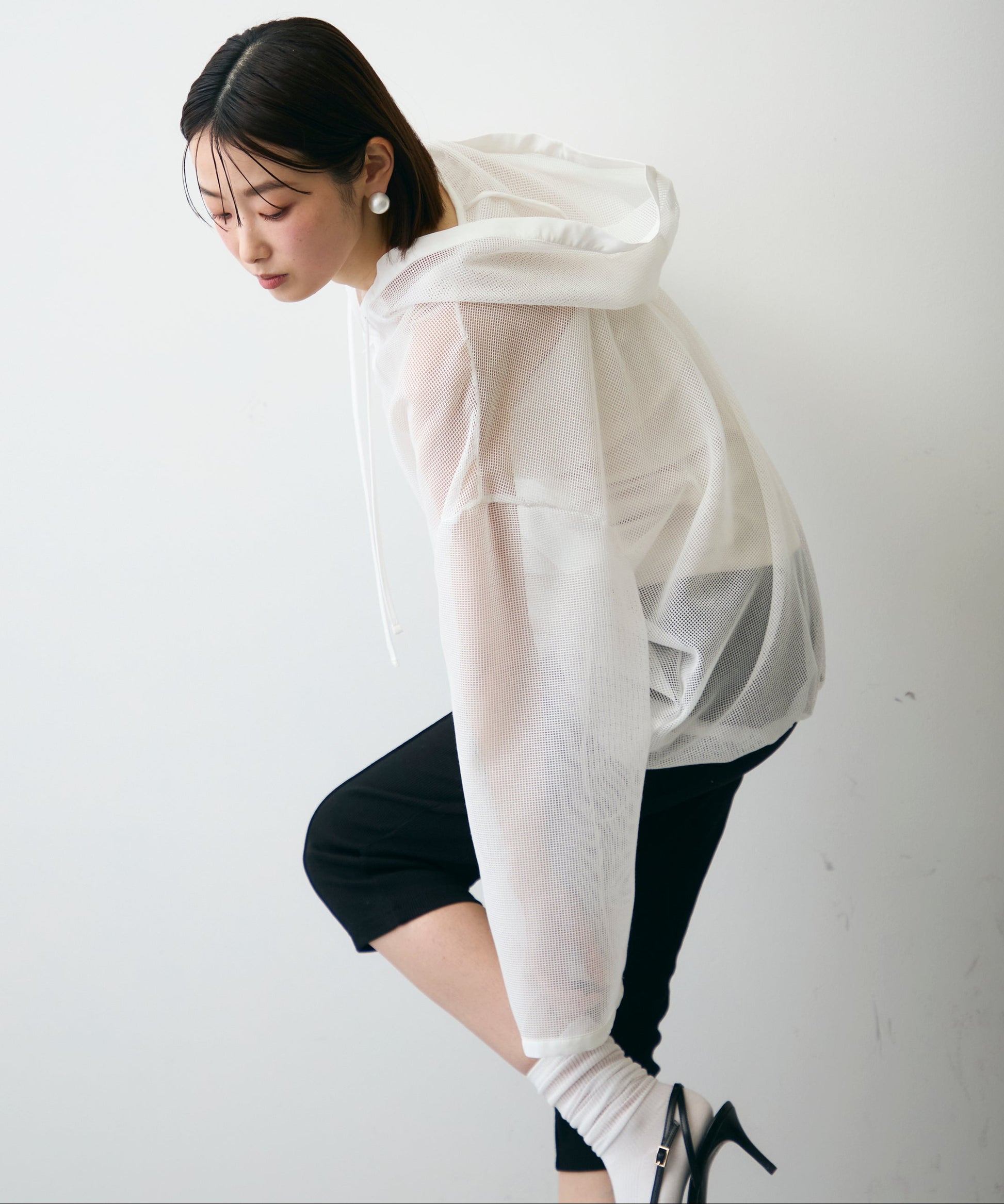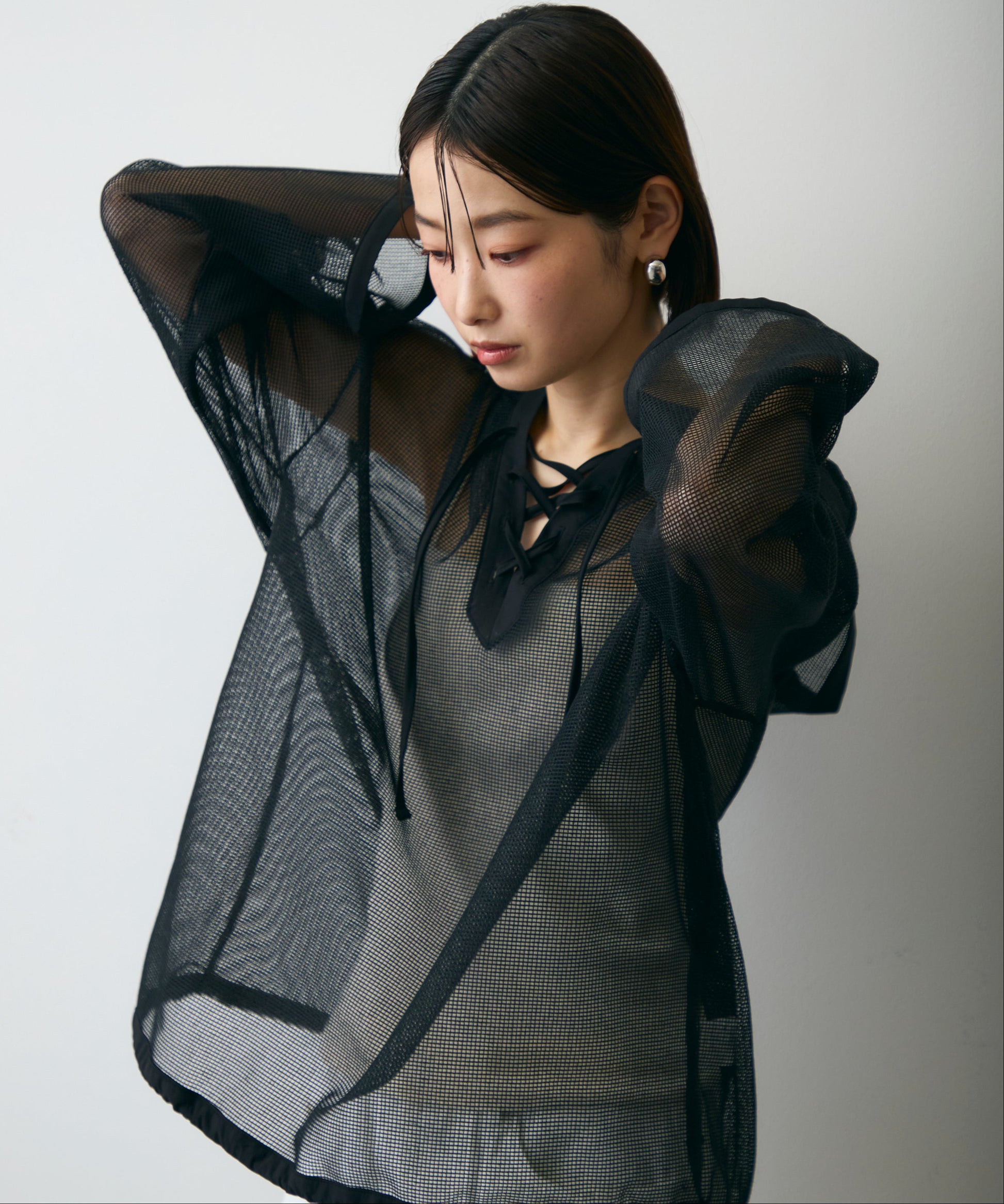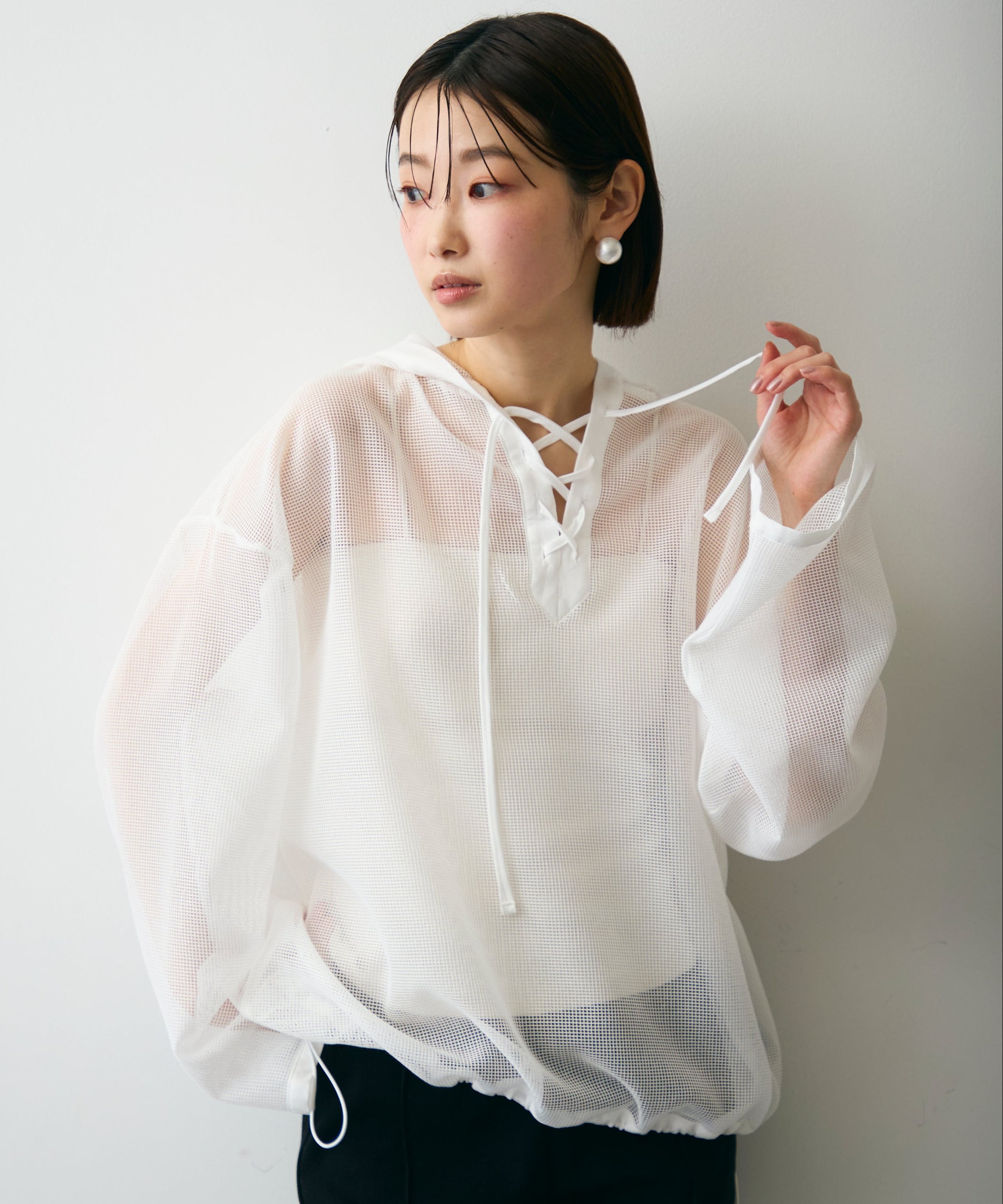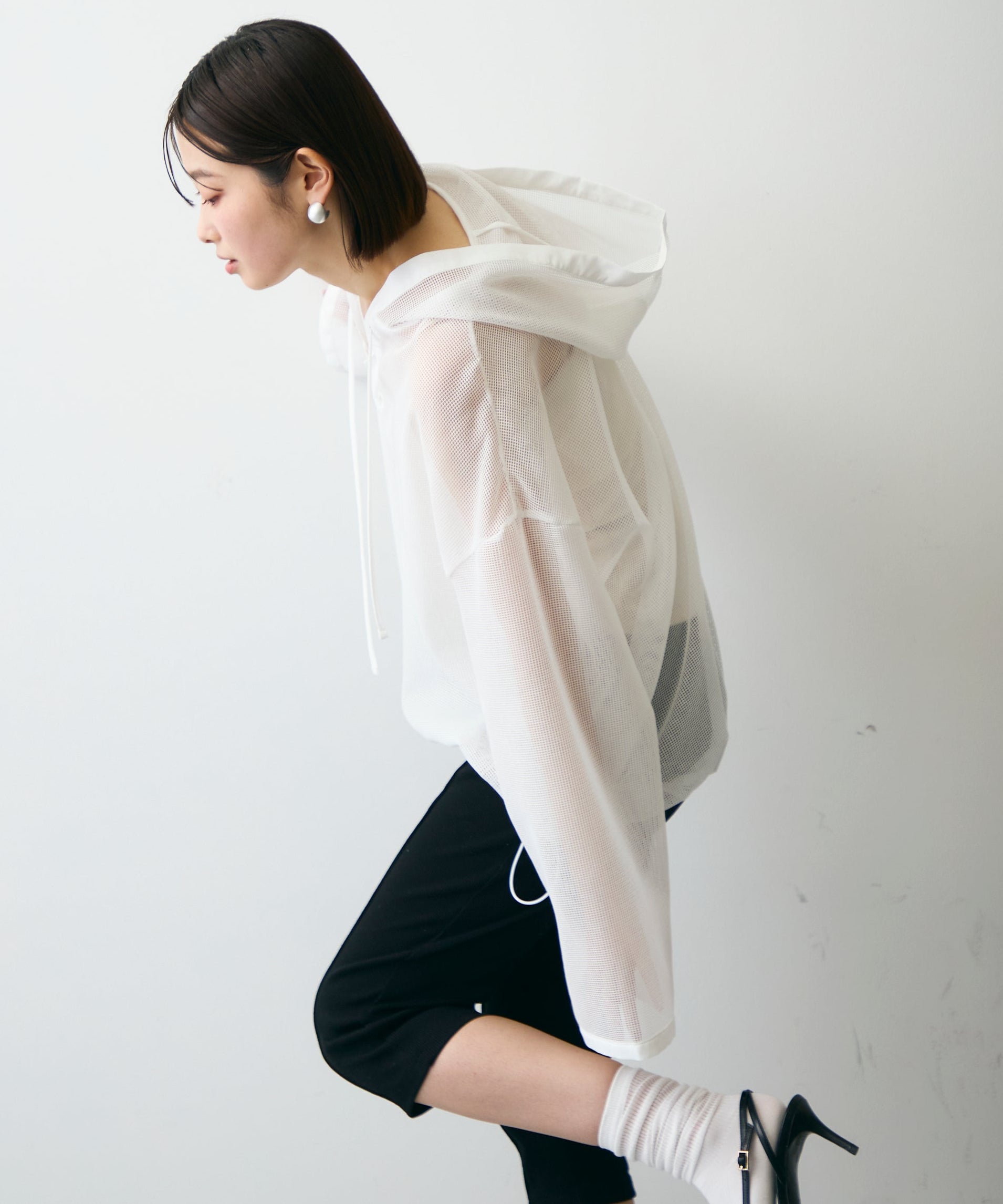 軽やかなメッシュ素材を使用した、抜け感たっぷりのフーディープルオーバー。程よい透け感がスタイリングに立体感をプラスし、レイヤードするだけで旬の雰囲気に。