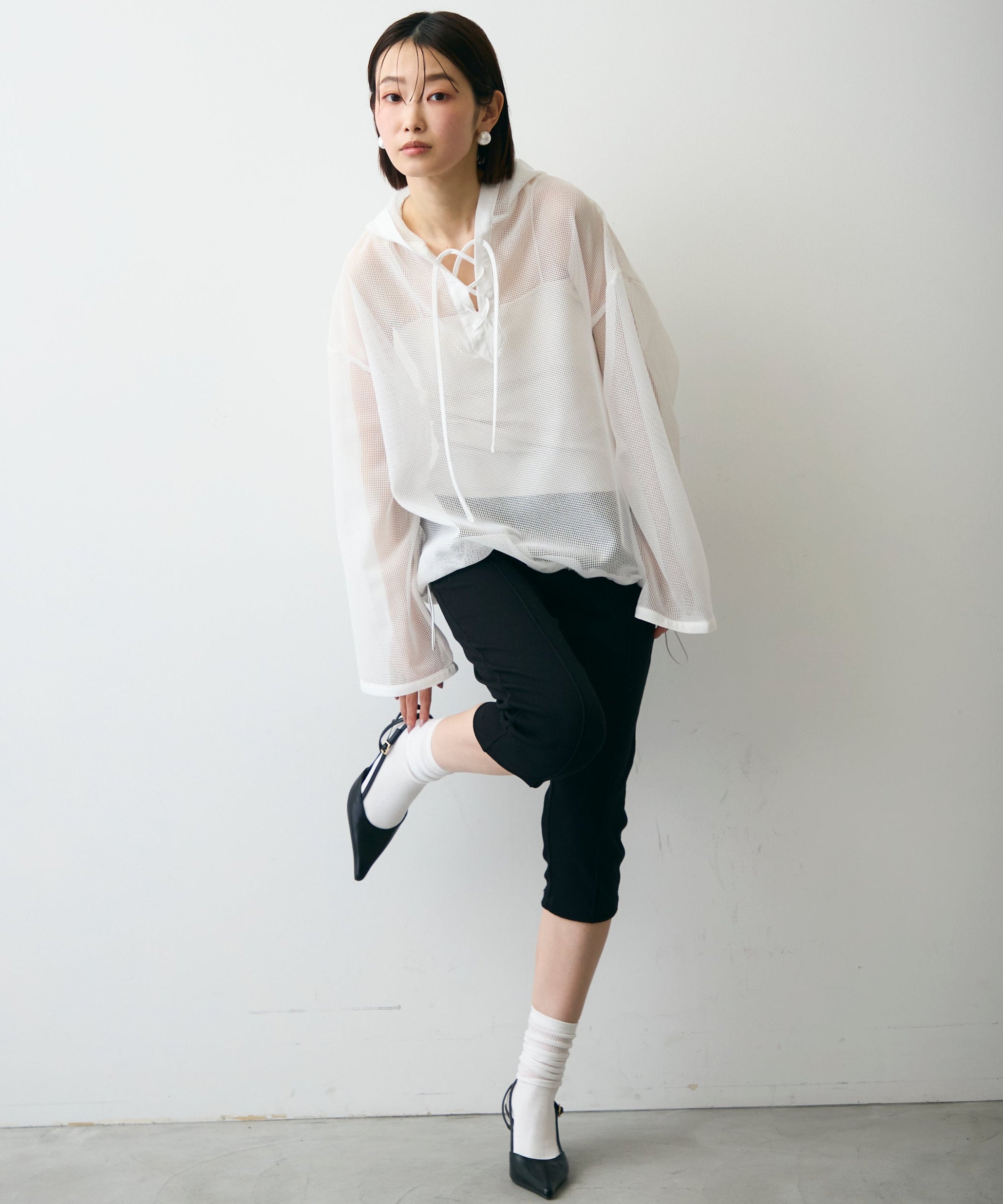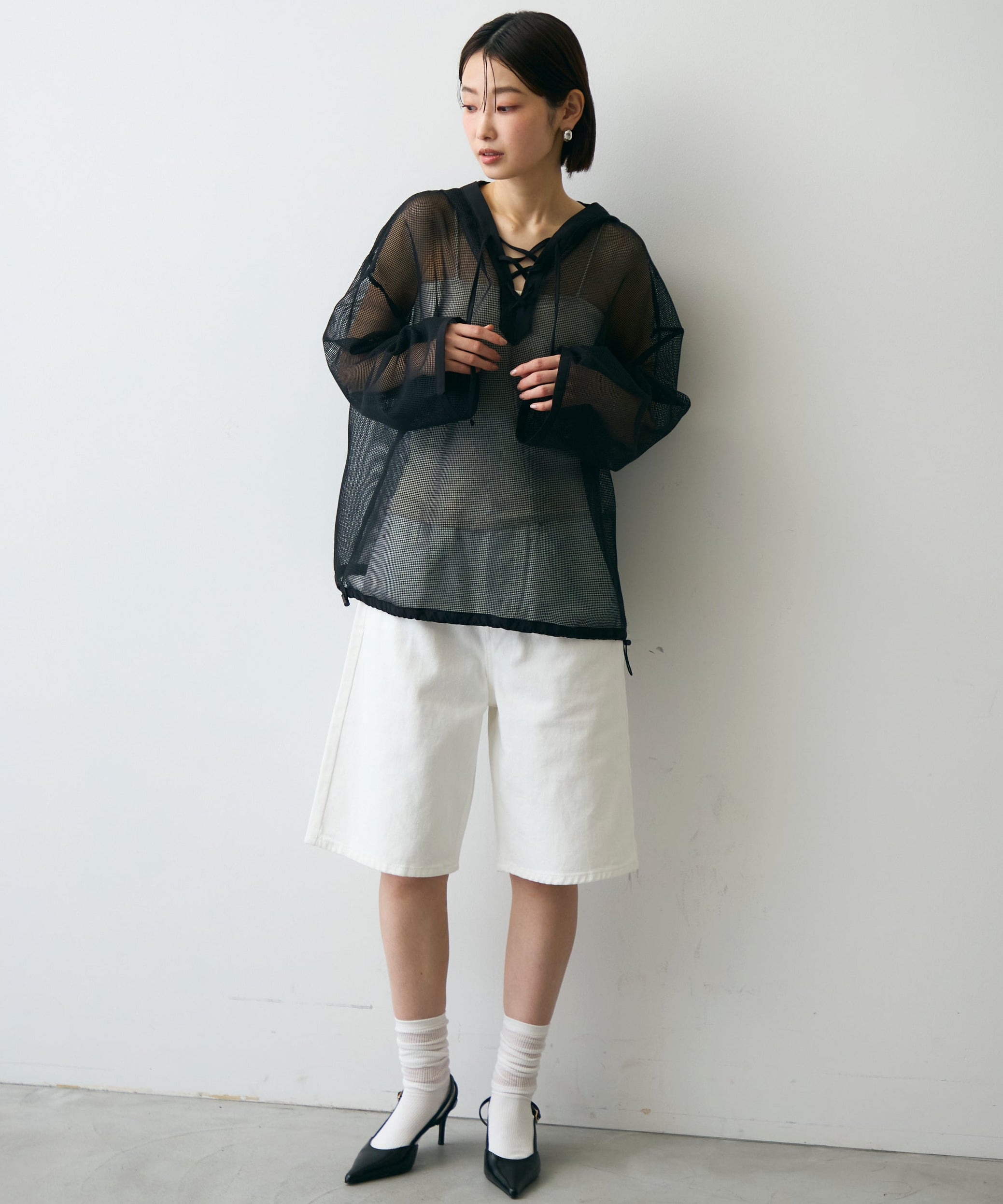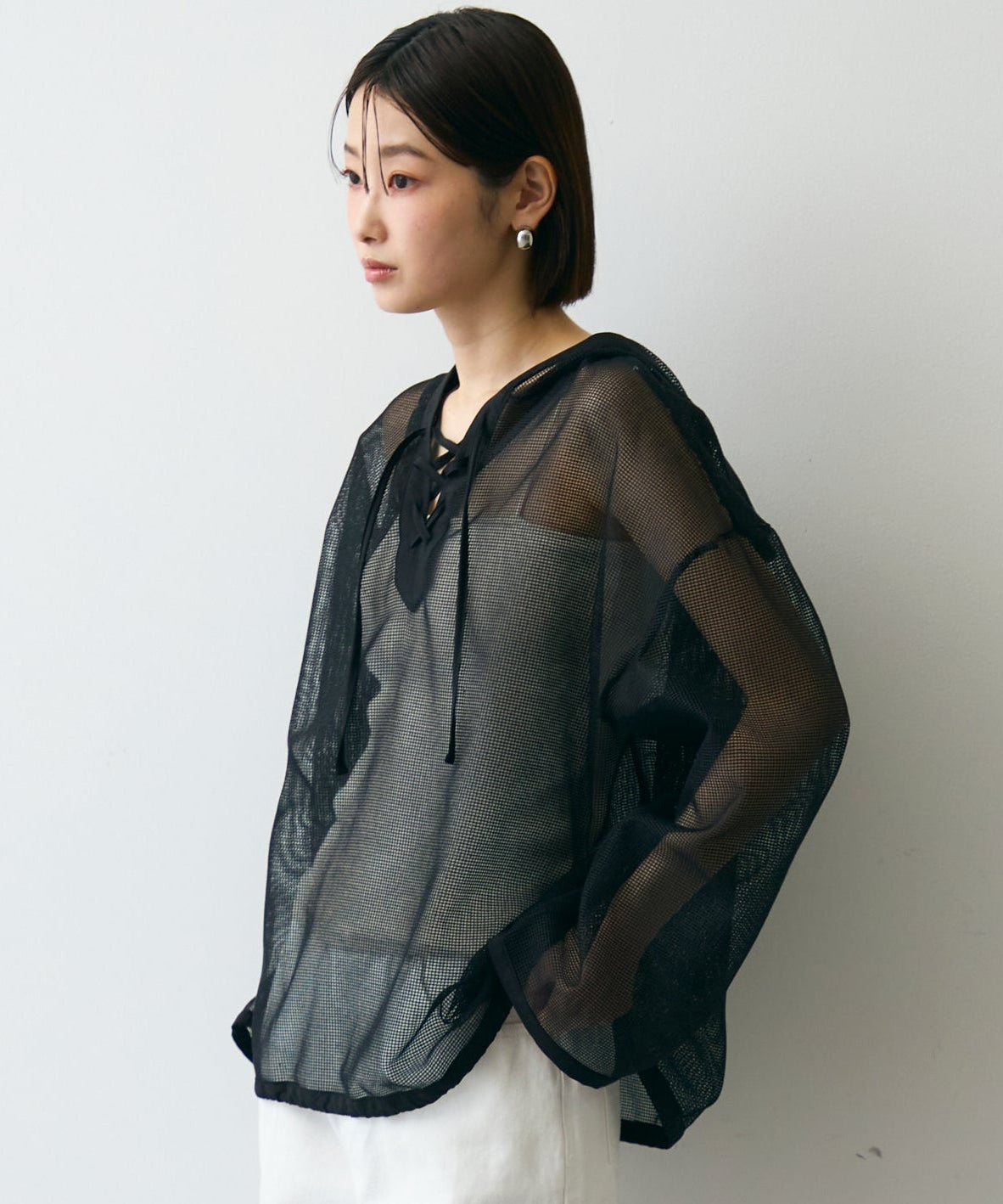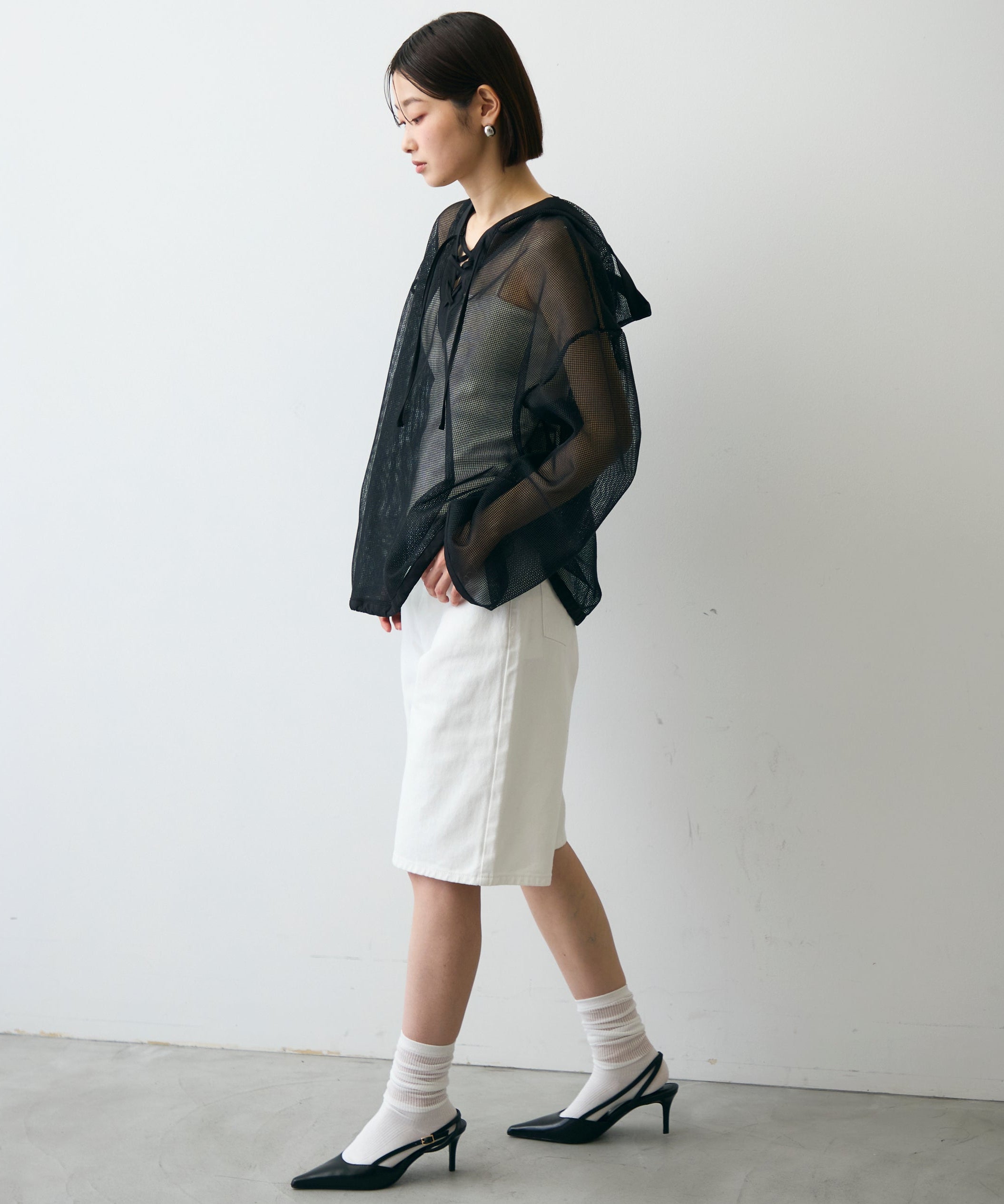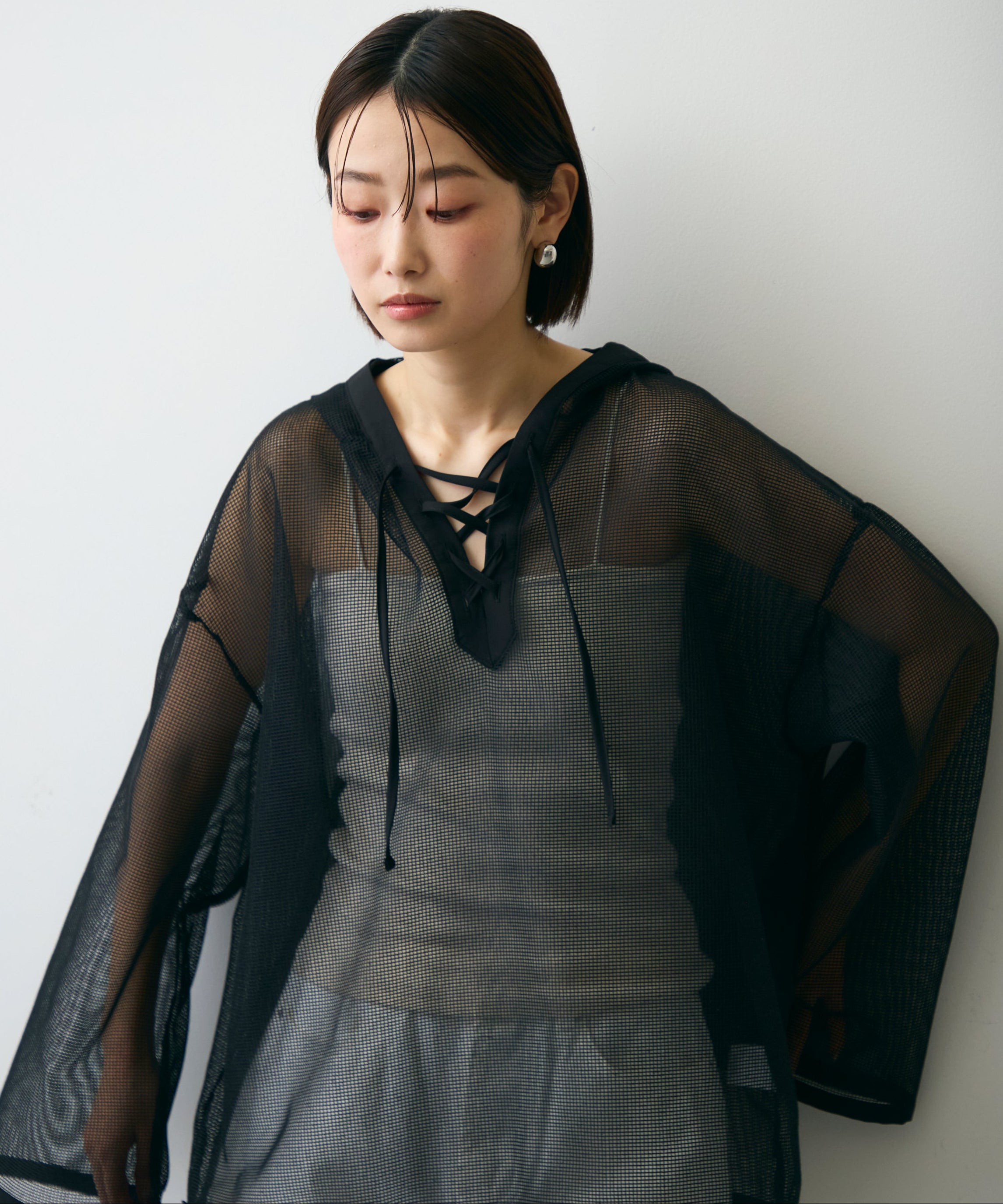 軽やかなメッシュ素材を使用した、抜け感たっぷりのフーディープルオーバー。程よい透け感がスタイリングに立体感をプラスし、レイヤードするだけで旬の雰囲気に。