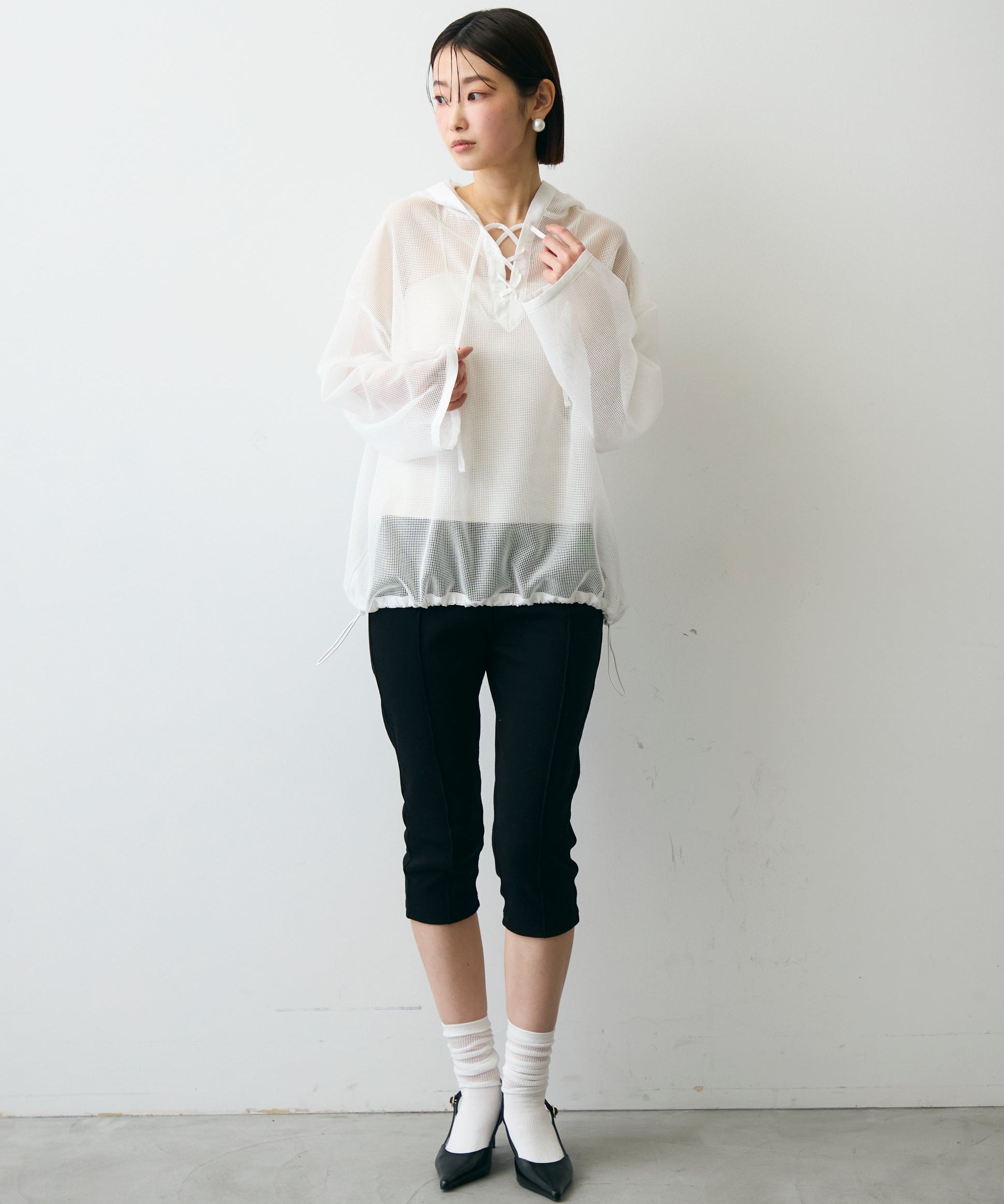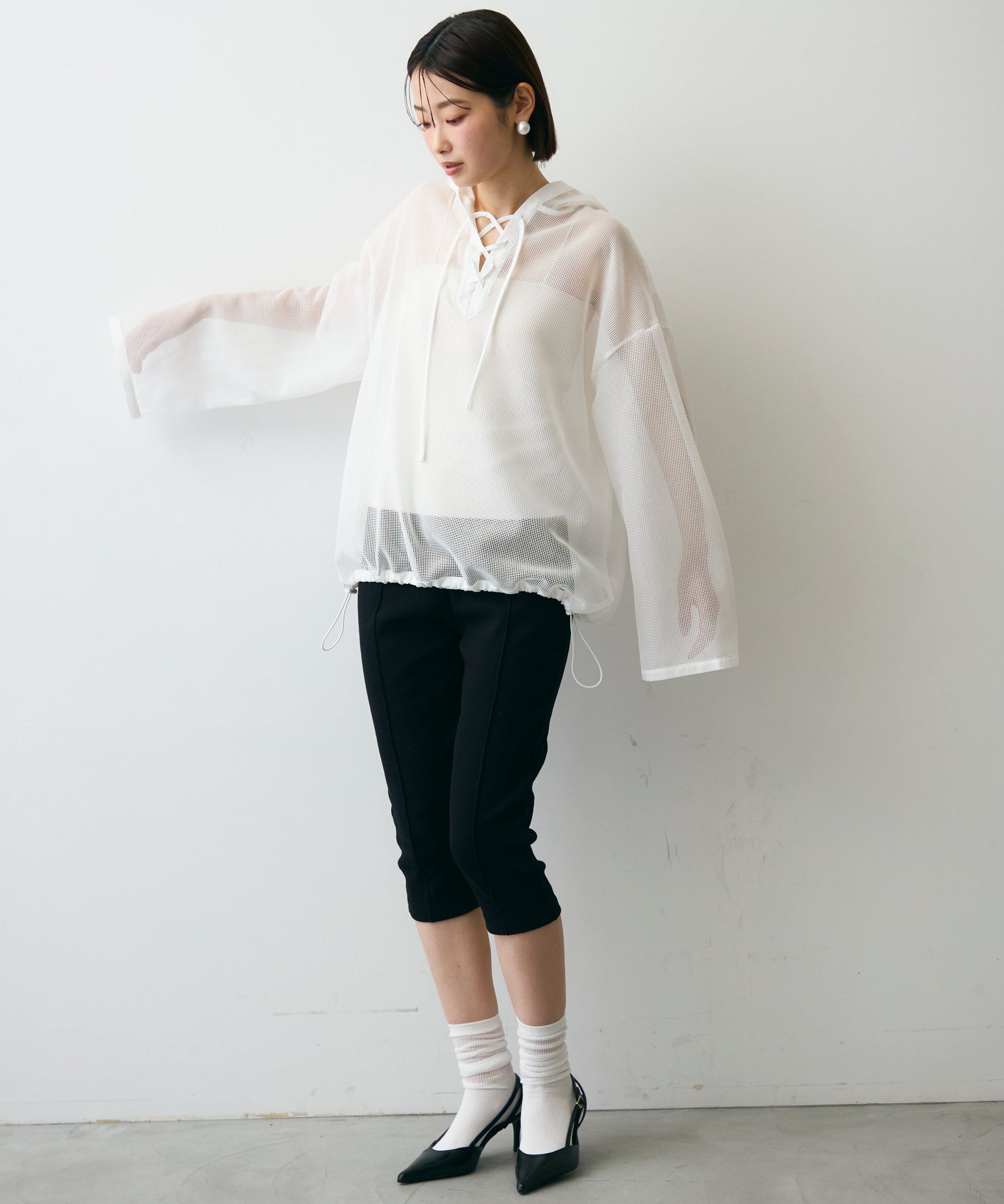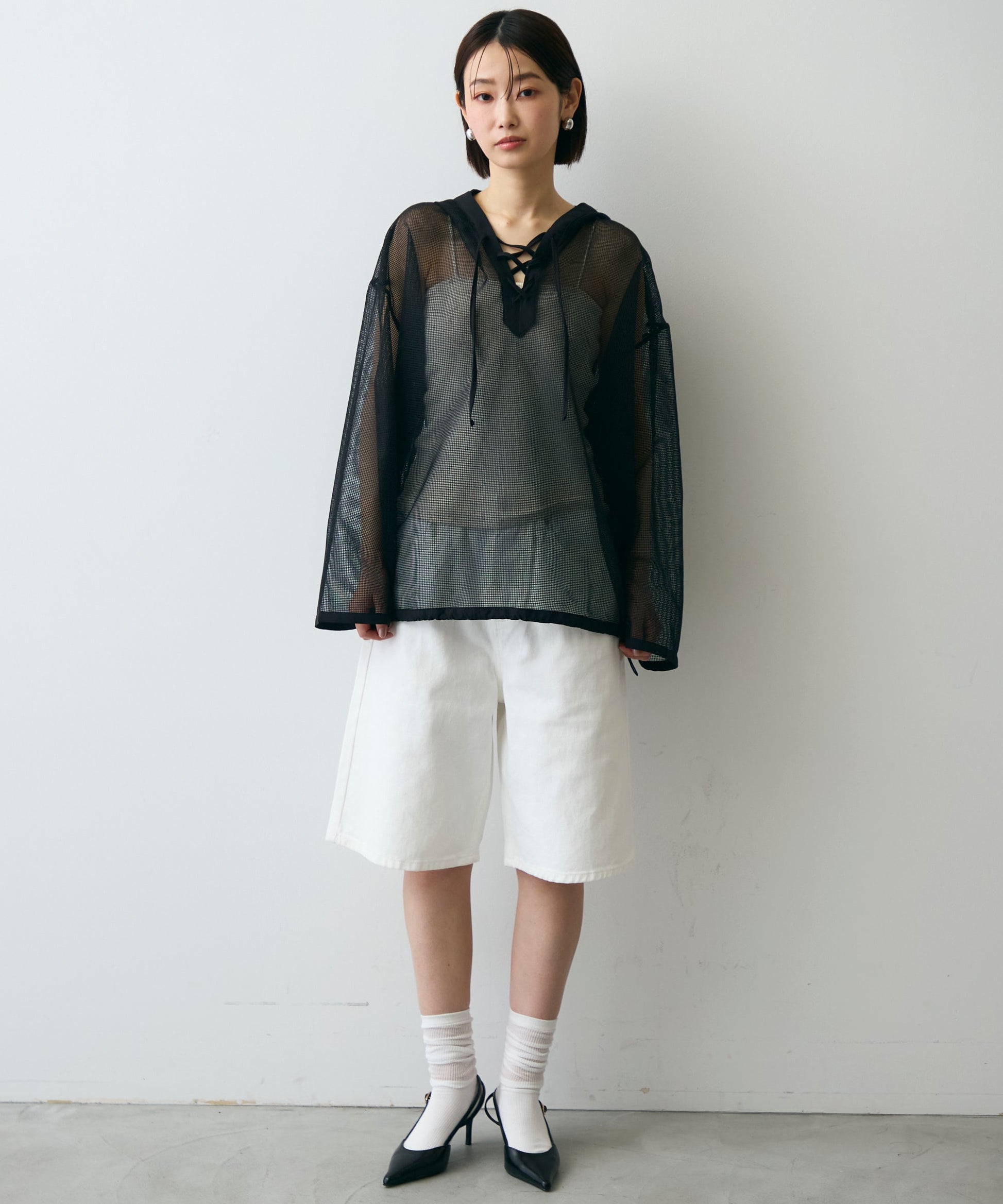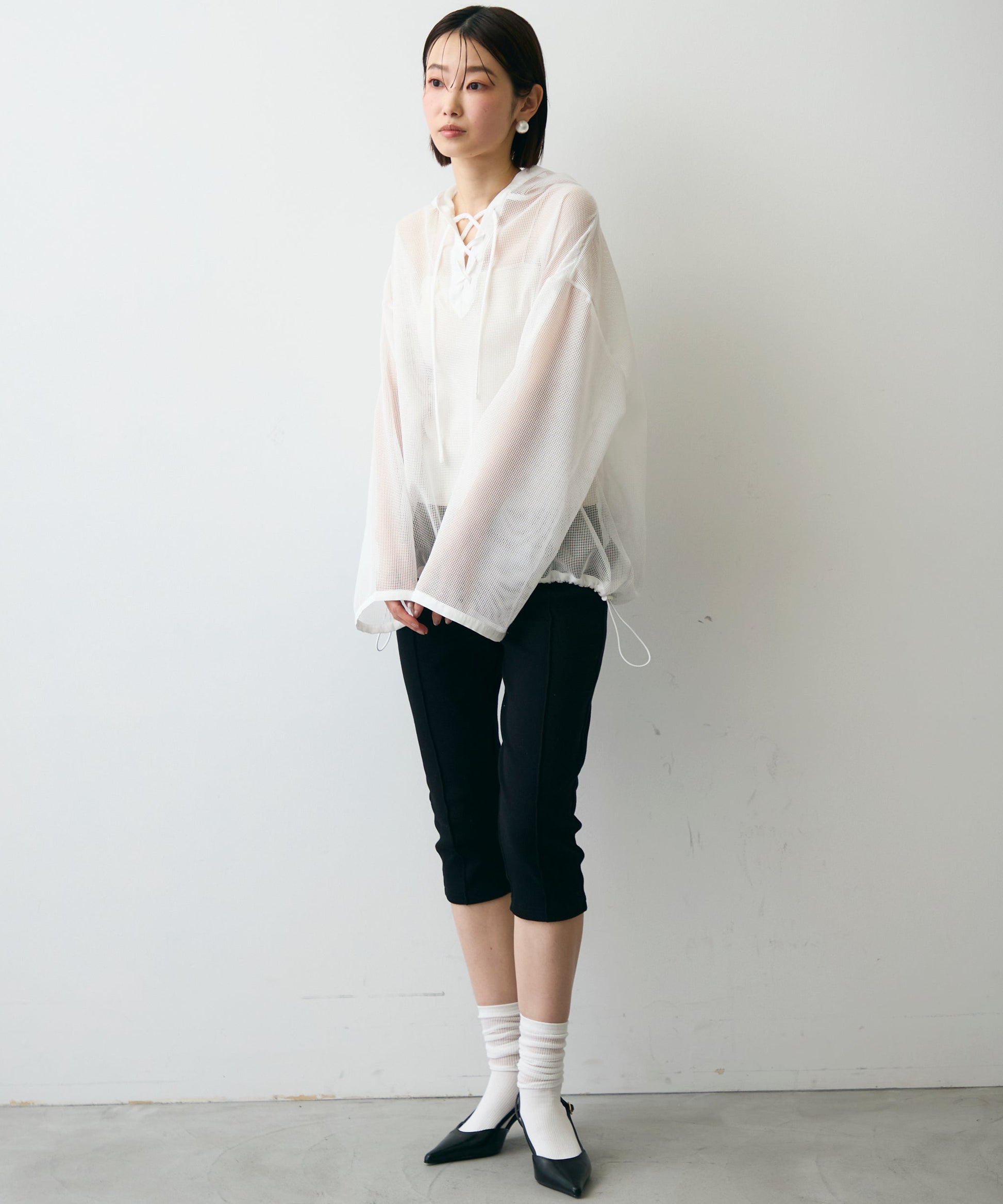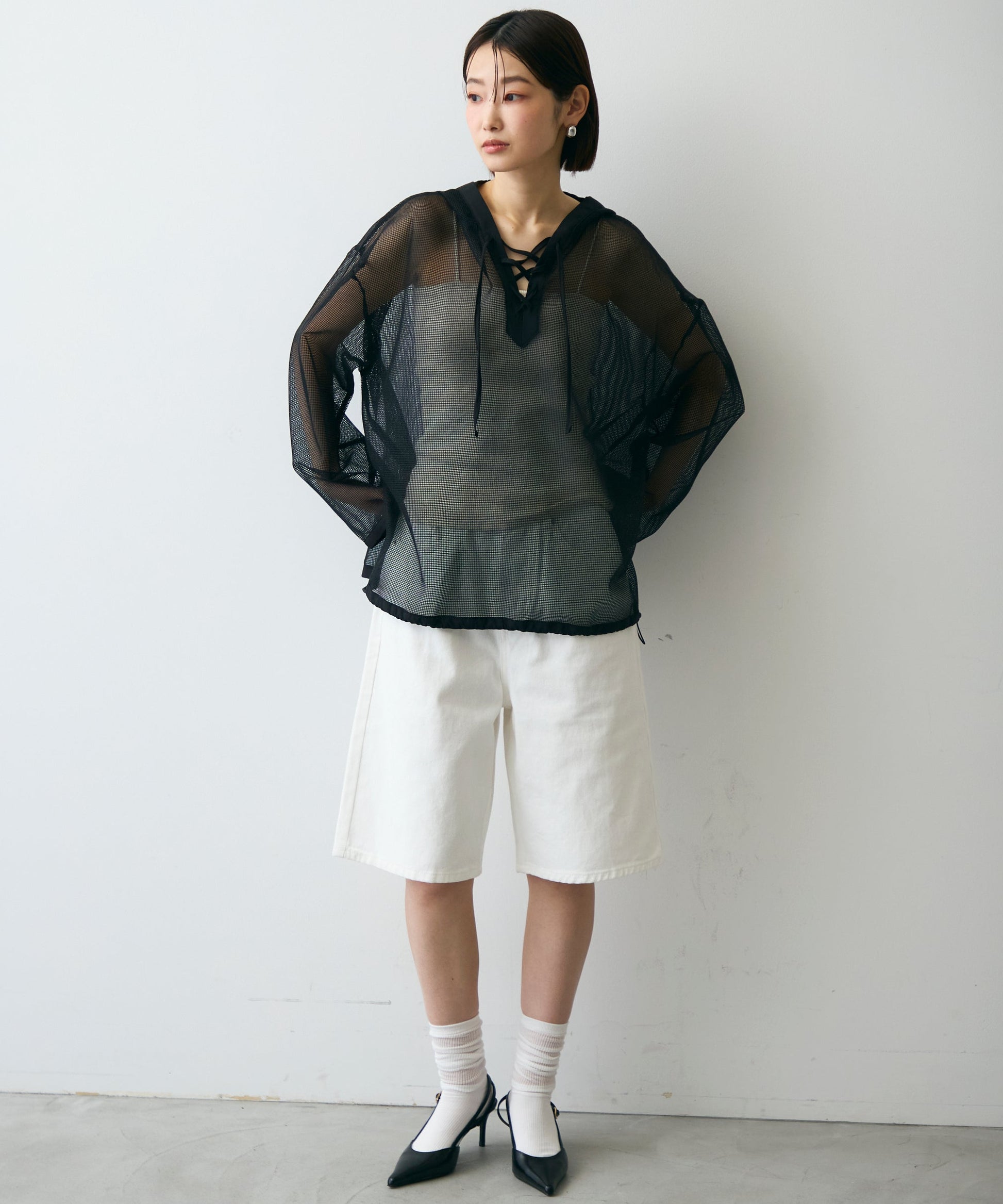 軽やかなメッシュ素材を使用した、抜け感たっぷりのフーディープルオーバー。程よい透け感がスタイリングに立体感をプラスし、レイヤードするだけで旬の雰囲気に。
